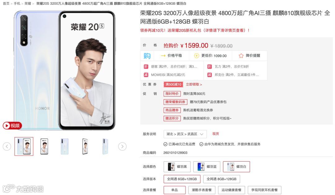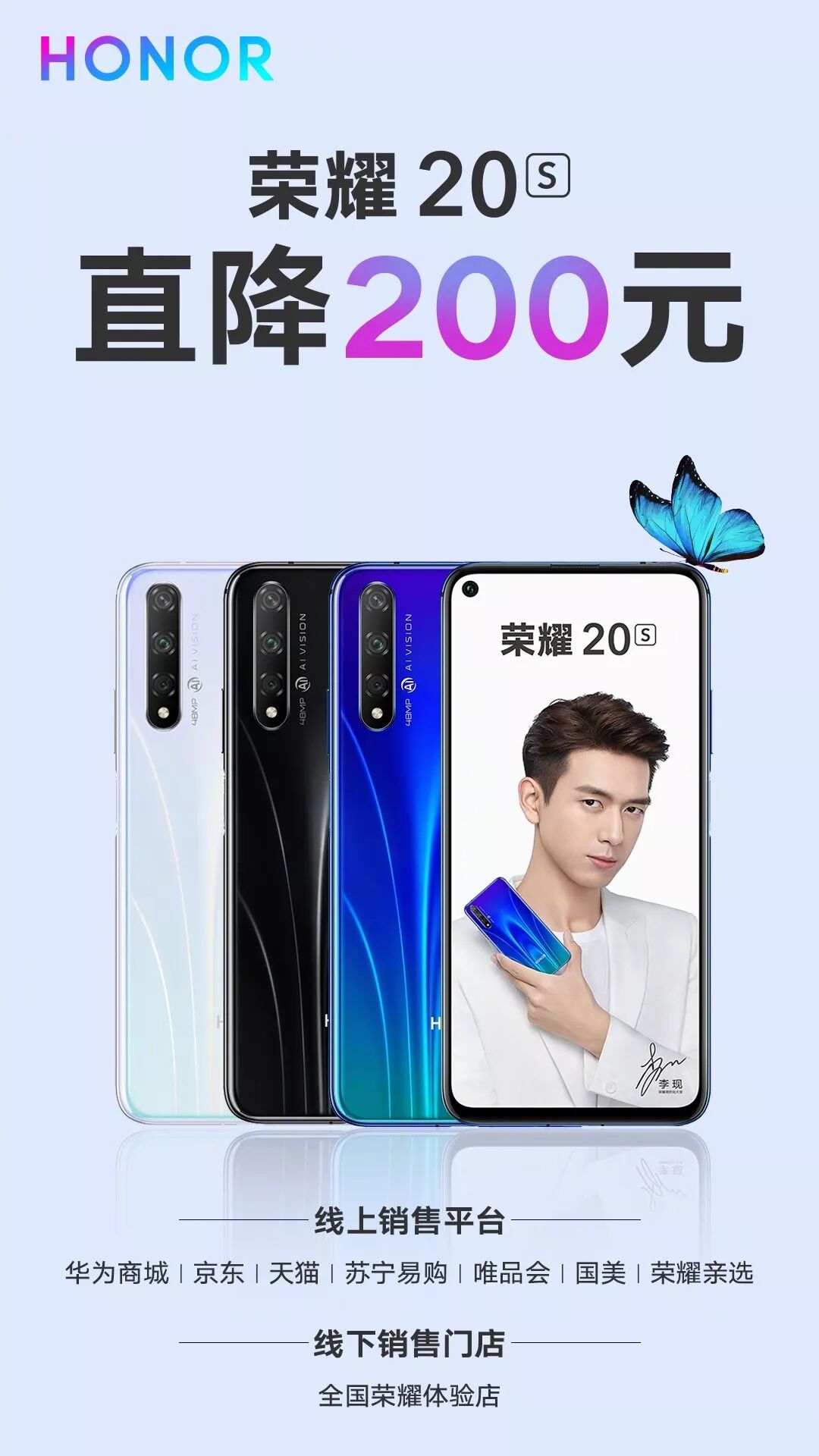 其中荣耀20S 6+128GB直降300元,1599元即可到手,而8+128GB直降200元,到手价1999元。
