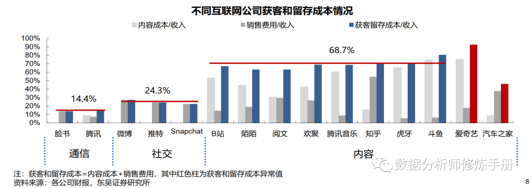 下图展示了不同业务的获客成本占收入的占比,可以看出,按照业务内容从通信到社交再到内容,获取用户的成本是逐渐上升的,这些成本可能是一些广告推广费用,也可能是一些版权费用等等。其中内容平台有一个特例是汽车之家,由于内容非常垂直,相对来说获客成本会更低一些,关注买车的人基本都会是汽车之家的用户。这可能也是为什么字节推出懂车帝与之竞争。