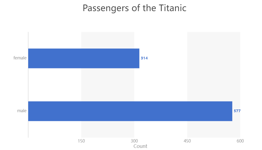 chart.animate(Config({"x": "Count", "y": "Sex", "label": "Count","title":"Passengers of the Titanic"}))