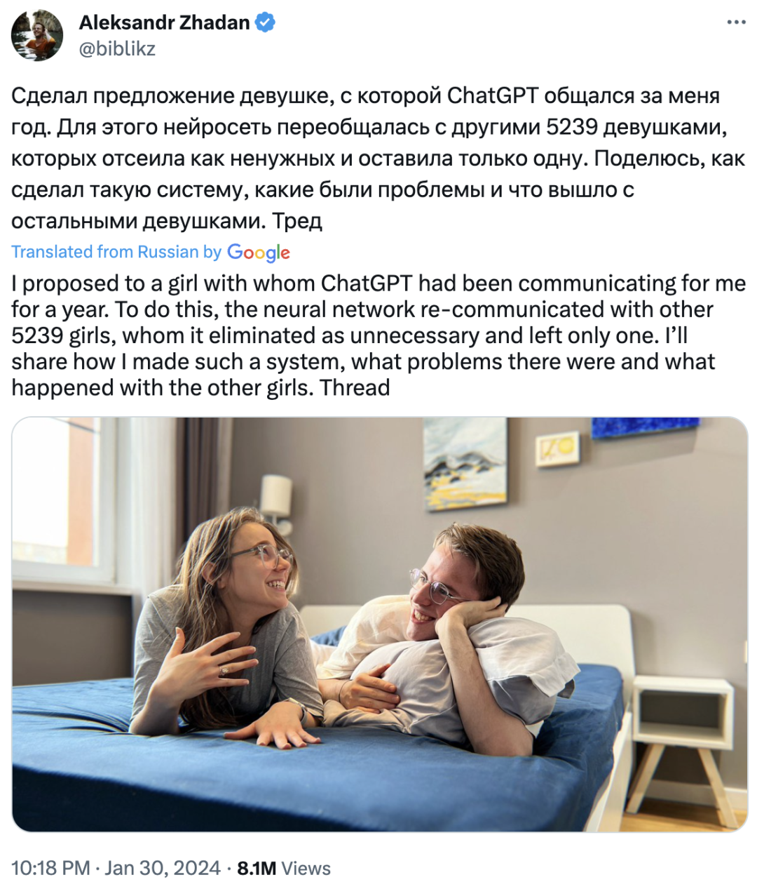 不久前,来自俄罗斯的开发者、社交平台 TenChat 的产品经理 Aleksandr Zhadan,在自己的社交账号上公布了婚讯,并表示 ChatGPT 是幕后「月老」。 Aleksandr Zhadan 公布婚讯 在锁定真爱前,Aleksandr 已经在 AI 的帮助下尝试与 5,239 名女生进行过沟通,遇到未婚妻后,更是借助 ChatGPT 与她交流了一年。在这个过程中,Aleksandr 还顺手沉淀出了一套 AI 系统,将 ChatGPT 与照片识别软件配合使用,不仅能识别、过滤掉个人资料中含有露骨照片、星座等信息的女生,还能够模仿 Aleksandr 与约会对象交流。 V1 版 Datebot 「用 ChatGPT 成功找到未婚妻」这一极具戏剧性的事件随即引发热烈讨论,Aleksandr 也在社交平台公布了自己训练该系统的全部过程,如上图所示。尽管已经有不少网友送上了祝福,并且跃跃欲试,但同时也有负面声音传来,一方面质疑事件的真实性,另一方面抨击 Aleksandr 的真诚度不足。 抛开炒作不谈,Aleksandr 的这套 Datebot 虽然框定于程序之内,但确实能够帮助那些希望通过社交平台找到另一半的网友,节省筛选时间、提高成功率。不过,无论是爱情还是婚姻,都是基于双方意愿的,正如 Aleksandr 的未婚妻也在他们向婚姻登记处提交申请时,得知了这位幕后月老的存在,并未因此叫停这段关系。 换作你,是否能接受自己的另一半拥有 Datebot 呢?