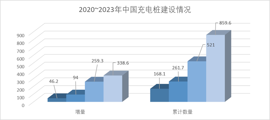 根据中国充电联盟数据,2023年,我国充电基础设施增量为338.6万台,累计数量达到859.6万台,同比增长30.6%,桩车增量比达到1∶2.8,完善的充电基础设施保障了新能源汽车的快速发展。