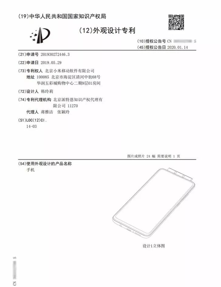 据了解,本次曝光的小米手机外观专利主题是「弹出式摄像头 升降全面屏手机」,报道称其最早申请于2019年的5月份,也就是常程口中的3.3万件中的其中一个。