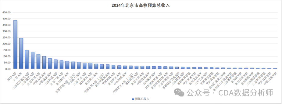 通过筛选北京市高校情况,明显发现,清华北大在北京市中预算收入位居第一第二,其次是北京航空航天大学,通过计算发现,北京市在高校预算上总共投入了2143.81亿元,这在财政支出方面也是一笔不小的数目。