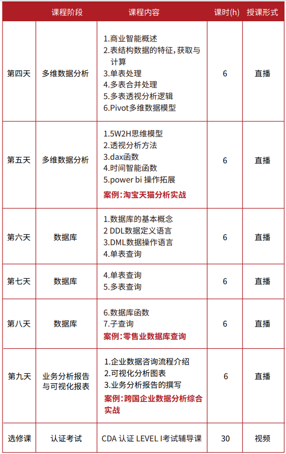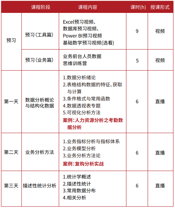 我们的课程体系设计科学合理,从Excel预习视频到Power BI预习视频,从基础数学预习视频到业务分析方法论,涵盖了数据分析的各个方面,帮助您构建完整的数据分析知识体系。此外,还特别安排了多个实战案例,如人力资源分析之考勤数据分析、复购分析实战、淘宝天猫分析实战以及零售业数据库查询等,让您在实战中检验所学,真正做到学以致用。