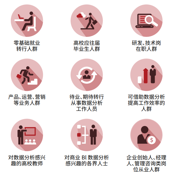 本课程适合零基础学员学习,课程设计遵循循序渐进的教学规律,包含Excel、PowerBI、SQL 数据库、统计学基础等工具与理论课程模块,同时包含大量基于实际业务场景的各行业实战项目案例,比如通过制作客户运营分析仪表板实现客户价值分析、挖掘潜在客户、监控电商运营指标等,提升电商运营效益。课程技能覆盖各行业的业务数据分析岗、数据运营岗、数据产品岗、数据营销岗等数据分析专项技能岗所要求的技能,同时适用于财务数据分析、人力资源数据分析等数据赋能岗。