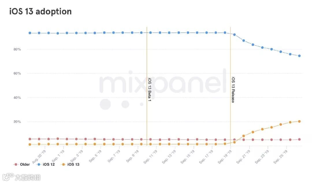 另据第三方数据显示,在iOS13发布一周后,其安装率已达 20%整体数据略高于去年 iOS 12 的同期安装率(19.14%),另鉴于今年 iPad 设备有独立的 iPadOS ,所以 iOS 13 的普及速度还蛮亮眼,不知道大家更了吗~