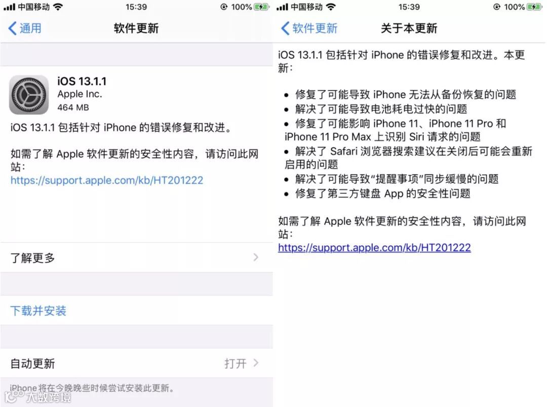 今晨,苹果正式推送了iOS 13.1.1 ,针对 iPhone 进行了一些错误修复和改进。具体包括:修复了可能导致 iPhone 无法从备份恢复的问题;解决了可能导致电池耗电过快的问题;