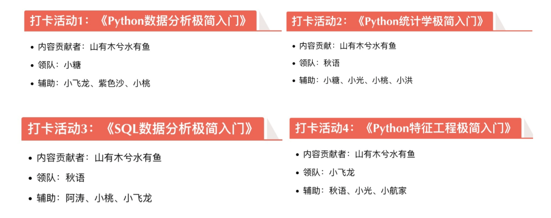 为了保证学习效果,活动除了交流群外,鼓励大家自由组队,在小组中相互监督、相互激励,共同完成学习任务,从而提高学习效果,激发合作意识和团队精神。