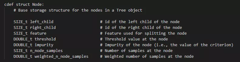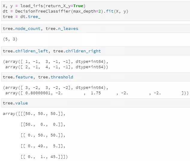 clf.tree_.children_leftclf.tree_.children_rightclf.tree_.featureclf.tree_.capacityclf.tree_.thresholdclf.tree_.valueclf.tree_.impurityclf.tree_.decision_path