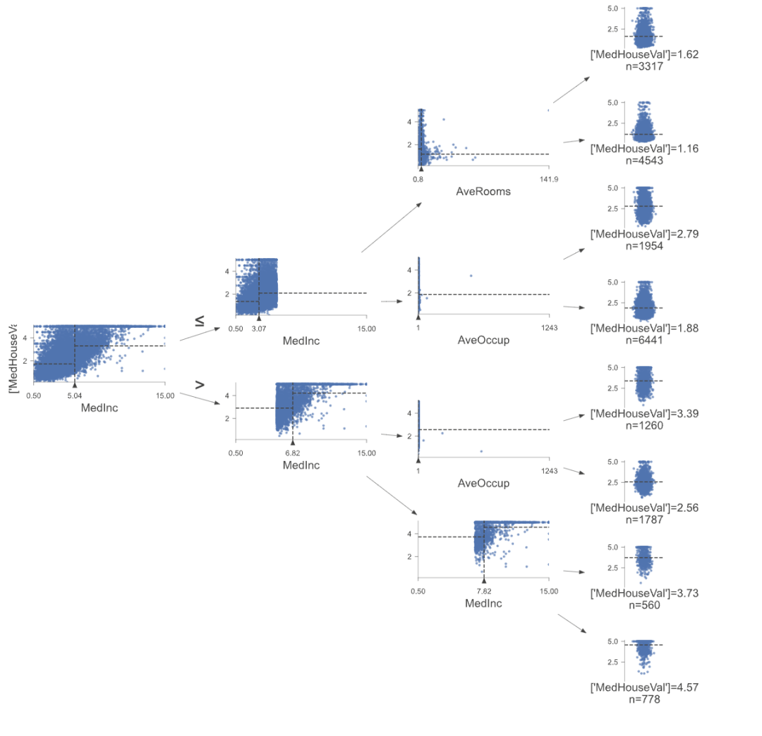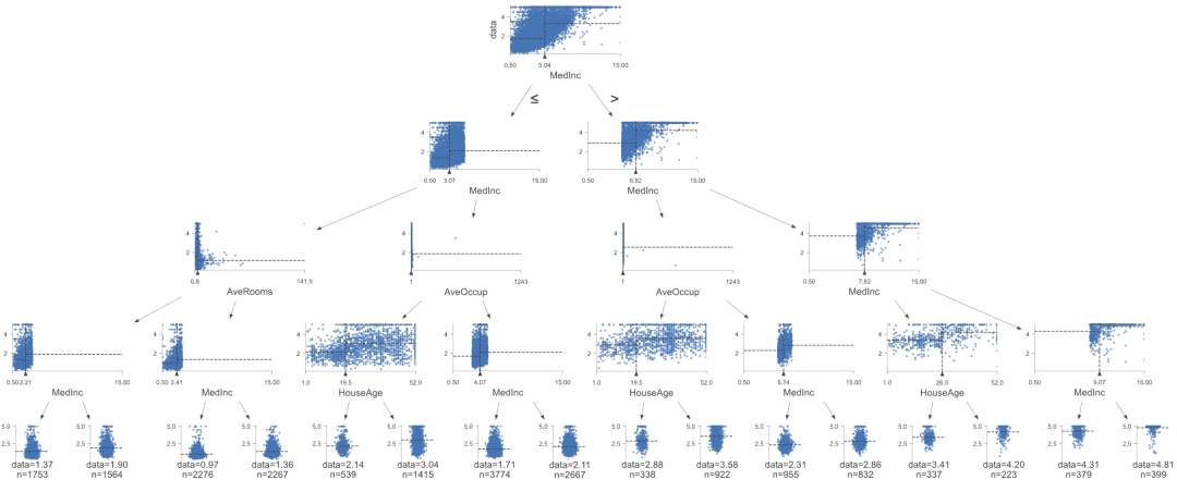 # 回归树可视化from sklearn.datasets import fetch_california_housingfrom sklearn.tree import DecisionTreeClassifier,DecisionTreeRegressorimport dtreevizclf = DecisionTreeRegressor(max_depth=5)data = fetch_california_housing()X = data.dataY = data.targetclf.fit(X, Y)viz_model = dtreeviz.model(clf,X_train=X,y_train=Y,target_name=data.target_names,feature_names=data.feature_names)v = viz_model.view() # render as SVG into internal objectviz_model.view()v.show() # pop up windowv.save("/tmp/iris.svg") # optionally save as svg