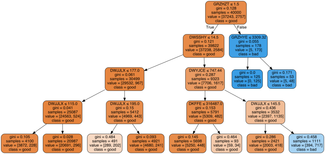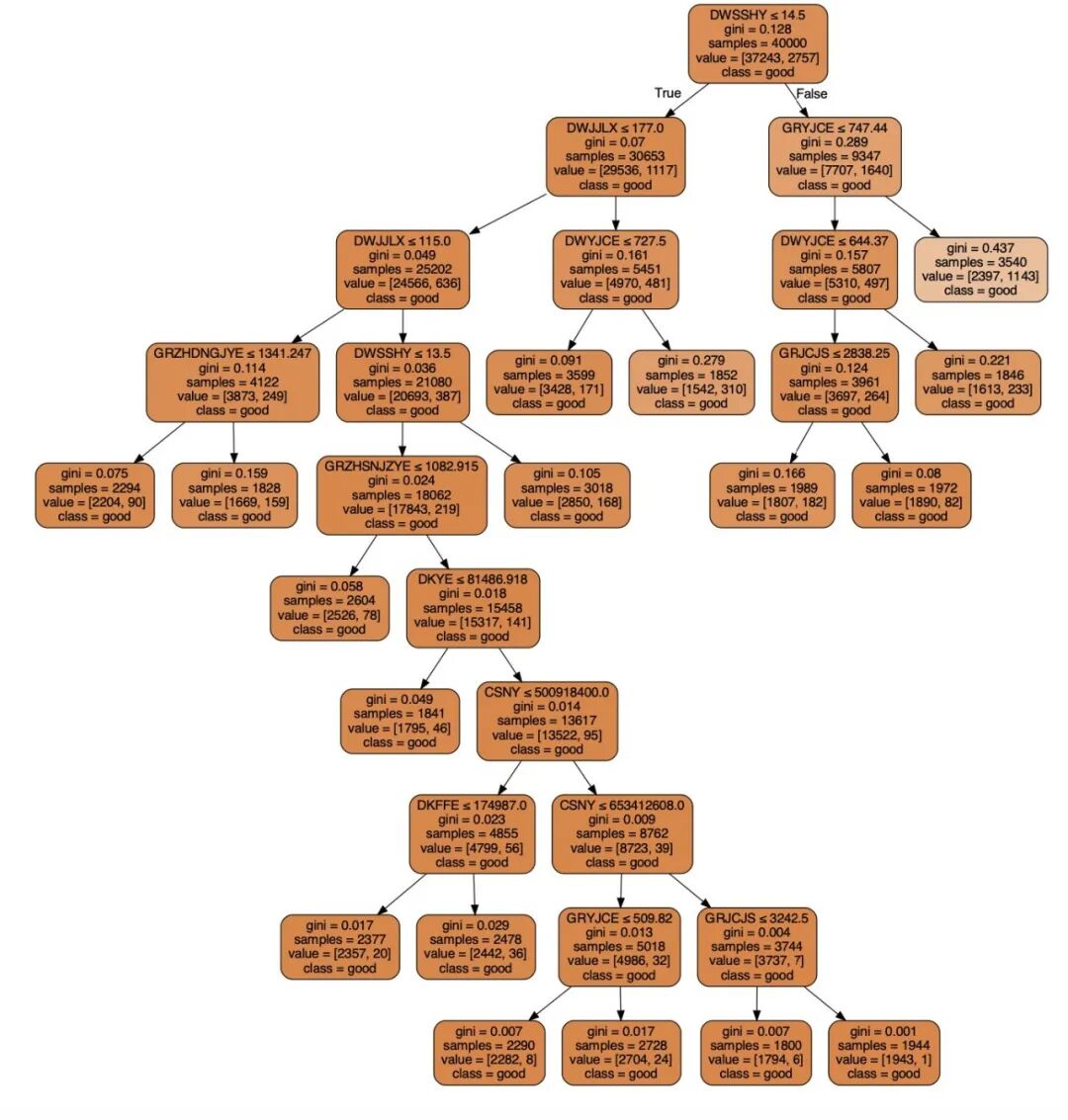 #构建训练集X = train.loc[:,'XINGBIE':'DKLL']Y = train['label']# 训练一个模型from sklearn import treeclf = tree.DecisionTreeClassifier(max_depth=9,min_samples_leaf=1800)clf = clf.fit(X, Y)import graphvizdot_data = tree.export_graphviz(clf,out_file=None,feature_names=X.columns,class_names=['good','bad'],filled=True, rounded=True,special_characters=True)graph = graphviz.Source(dot_data)graph#graph.save('prueba2.png')