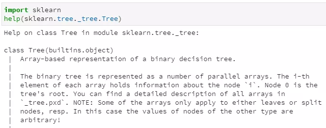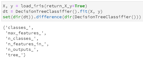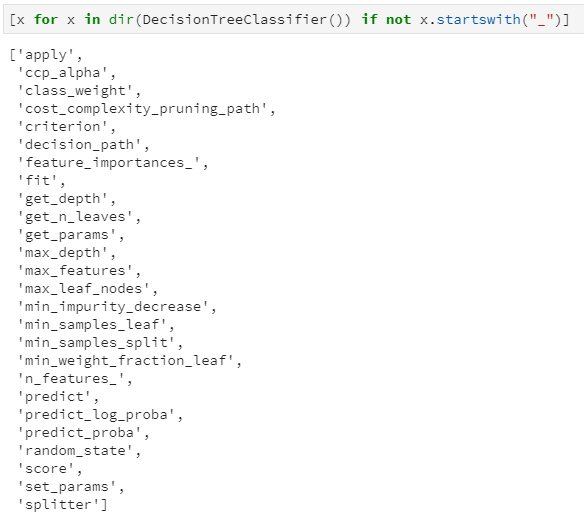 from sklearn.datasets import load_irisfrom sklearn import treeiris = load_iris()clf = tree.DecisionTreeClassifier()clf = clf.fit(iris.data, iris.target)clf.classes_[x for x in dir(clf) if not x.startswith('_')]