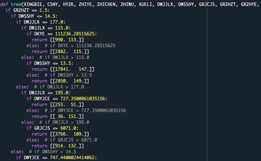 #数据读取import pandas as pdimport numpy as nppd.set_option('display.max_columns', None)#显示所有的列path = '/Users/wuzhengxiang/Documents/DataSets/RizhaoGongJiJin/train.csv'train = pd.read_csv(path).fillna(-1)train.columns#构建训练集X = train.loc[:,'XINGBIE':'DKLL']Y = train['label']## 训练一个决策树,这里限制了最大深度和最小样本树from sklearn import treeclf = tree.DecisionTreeClassifier(max_depth=3,min_samples_leaf=50)clf = clf.fit(X, Y)# 决策树规则提取-老方法from sklearn.tree import _treedef tree_to_code(tree, feature_names):tree_ = tree.tree_feature_name = [feature_names[i] if i != _tree.TREE_UNDEFINED else "undefined!"for i in tree_.feature]print ("def tree({}):".format(", ".join(feature_names)))def recurse(node, depth):indent = " " * depthif tree_.feature[node] != _tree.TREE_UNDEFINED:name = feature_name[node]threshold = tree_.threshold[node]print("{}if {} <= {}:".format(indent, name, threshold))recurse(tree_.children_left[node], depth + 1)print("{}else: # if {} > {}".format(indent, name, threshold))recurse(tree_.children_right[node], depth + 1)else:print("{}return {}".format(indent, tree_.value[node]))recurse(0, 1)tree_to_code(clf,X.columns)return [[161. 0.]]