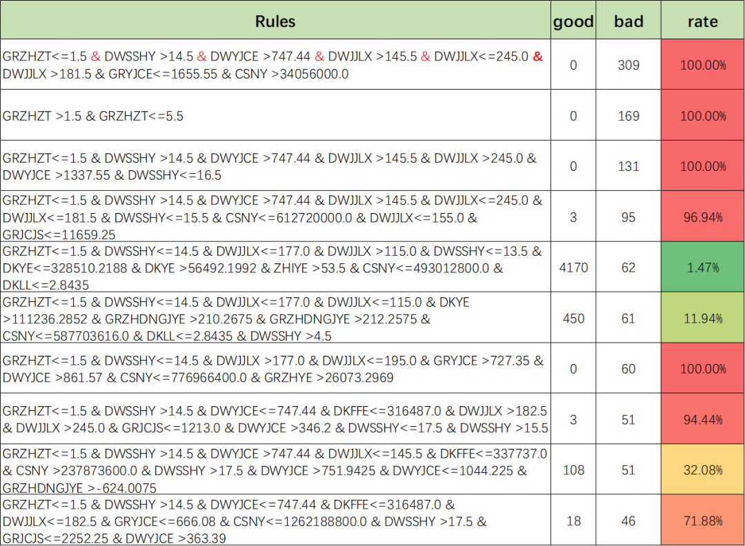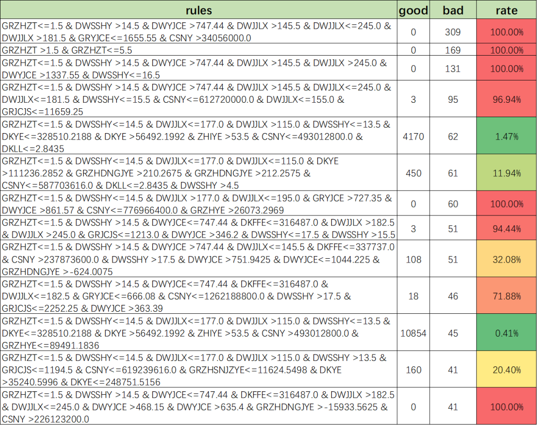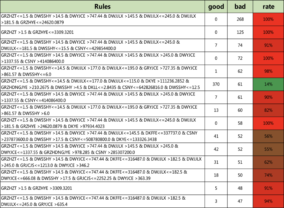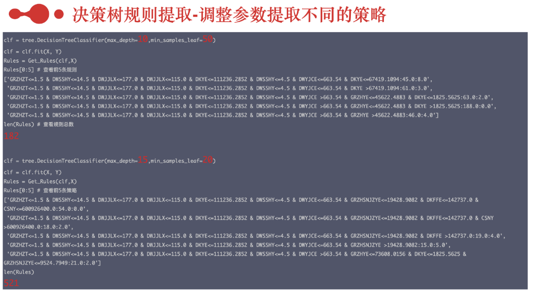 clf = tree.DecisionTreeClassifier(max_depth=15,min_samples_leaf=20)clf = clf.fit(X, Y)Rules = Get_Rules(clf,X)Rules[0:5]['GRZHZT<=1.5 & DWSSHY<=14.5 & DWJJLX<=177.0 & DWJJLX<=115.0 & DKYE<=111236.2852 & DWSSHY<=4.5 & DWYJCE<=663.54 & GRZHSNJZYE<=19428.9082 & DKFFE<=142737.0 & CSNY<=600926400.0:54.0:0.0','GRZHZT<=1.5 & DWSSHY<=14.5 & DWJJLX<=177.0 & DWJJLX<=115.0 & DKYE<=111236.2852 & DWSSHY<=4.5 & DWYJCE<=663.54 & GRZHSNJZYE<=19428.9082 & DKFFE<=142737.0 & CSNY >600926400.0:18.0:2.0','GRZHZT<=1.5 & DWSSHY<=14.5 & DWJJLX<=177.0 & DWJJLX<=115.0 & DKYE<=111236.2852 & DWSSHY<=4.5 & DWYJCE<=663.54 & GRZHSNJZYE<=19428.9082 & DKFFE >142737.0:19.0:4.0','GRZHZT<=1.5 & DWSSHY<=14.5 & DWJJLX<=177.0 & DWJJLX<=115.0 & DKYE<=111236.2852 & DWSSHY<=4.5 & DWYJCE<=663.54 & GRZHSNJZYE >19428.9082:15.0:5.0','GRZHZT<=1.5 & DWSSHY<=14.5 & DWJJLX<=177.0 & DWJJLX<=115.0 & DKYE<=111236.2852 & DWSSHY<=4.5 & DWYJCE >663.54 & GRZHYE<=73608.0156 & DKYE<=1825.5625 & GRZHSNJZYE<=9524.7949:21.0:2.0']len(Rules)521#可以遍历所有的规则for i in Rules:print(i)