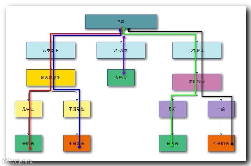 另外,tree中实际上并未直接标出各叶节点所对应的标签值,但完全可通过value属性来得到,即各叶子节点中落入样本最多的类别即为相应标签。甚至说,不仅可知道对应标签,还可通过计算数量之比得到相应的概率!