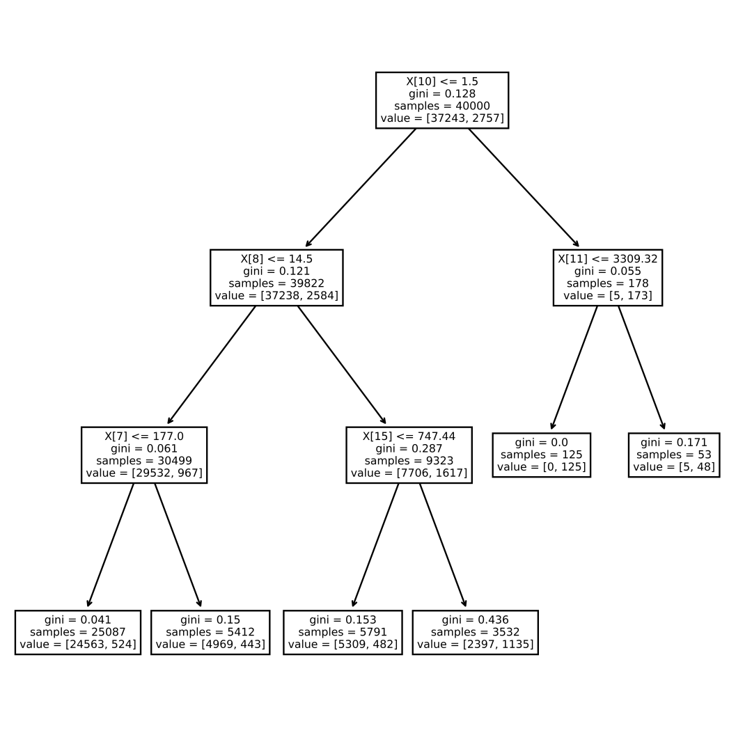 ## 训练一个决策树,这里限制了最大深度和最小样本树from sklearn import treeclf = tree.DecisionTreeClassifier(max_depth=3,min_samples_leaf=50)clf = clf.fit(X, Y)