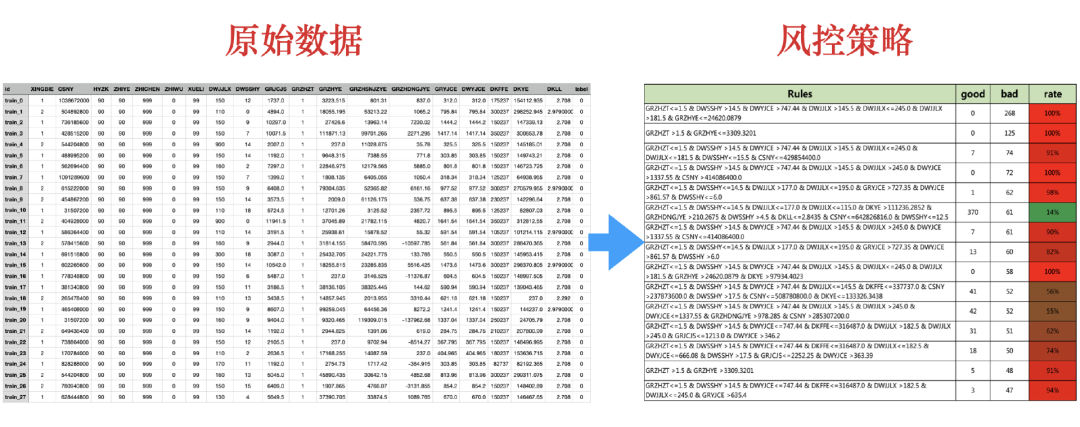 # 结果格式整理df = pd.DataFrame(Rules)df.columns = ['allrules']df['Rules'] = df['allrules'].str.split(':').str.get(0)df['good'] = df['allrules'].str.split(':').str.get(1).astype(float)df['bad'] = df['allrules'].str.split(':').str.get(2).astype(float)df['all'] = df['bad']+df['good']df['bad_rate'] = df['bad']/df['all']df = df.sort_values(by='bad_rate',ascending=False)del df['allrules']