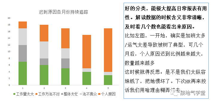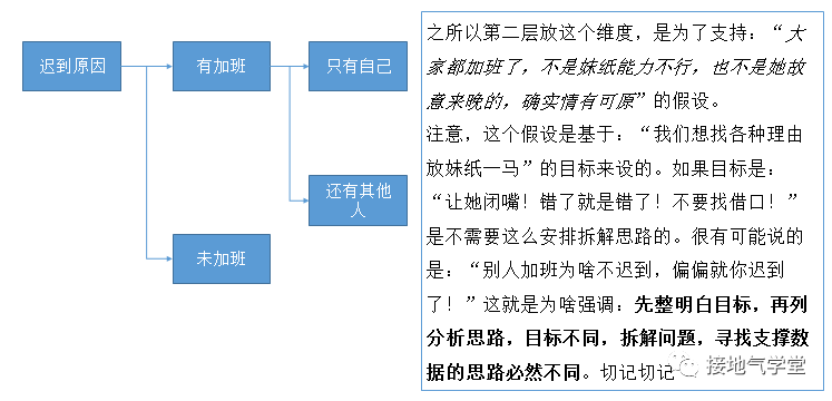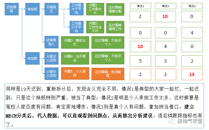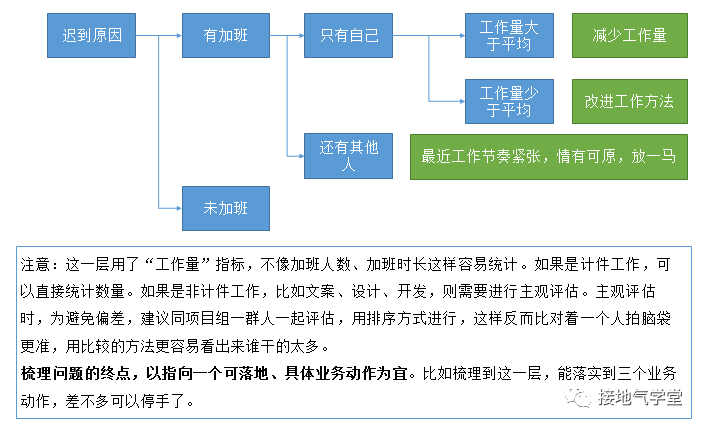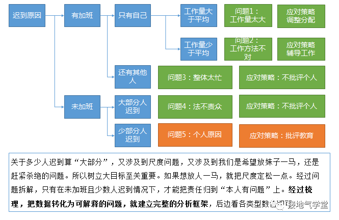 注意:分析的最终目的是能指导业务改善,因此分析逻辑应指向业务可以落地的地方。比如这一条逻辑的拆解,是完全没有考虑天气问题的。因为工作量多少,是领导可以安排的;法不责众,是领导可以接受的。