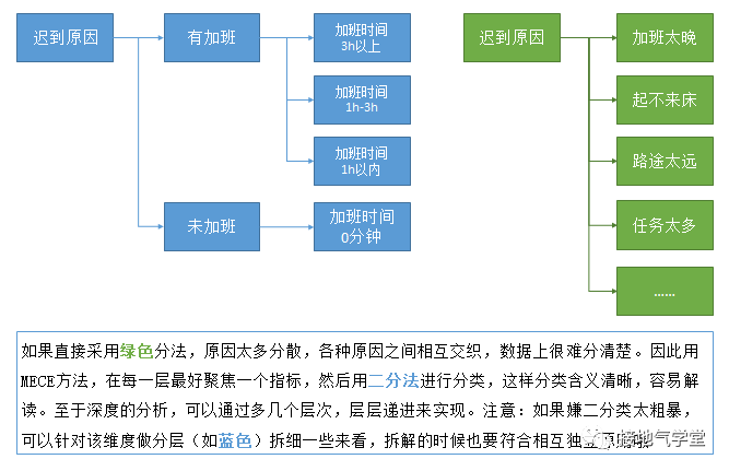 注意,相互独立,完全穷尽,是MECE操作完的最终结果。并不是要求一步到底,一下就能穷尽所有原因。在每一层原因分解的时候,用二分法才是最便捷的实现相互独立,完全穷尽的要求,因此分析问题的逻辑层次可以很多,但每一层用的指标尽量少,切分的清晰一点。