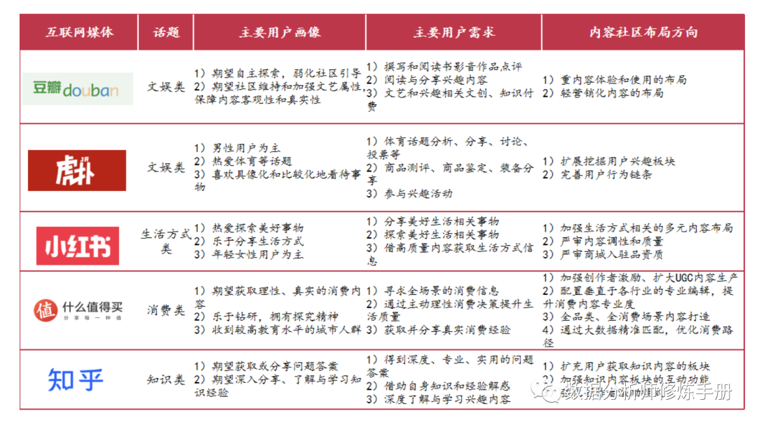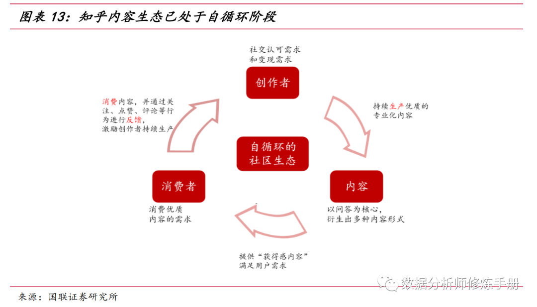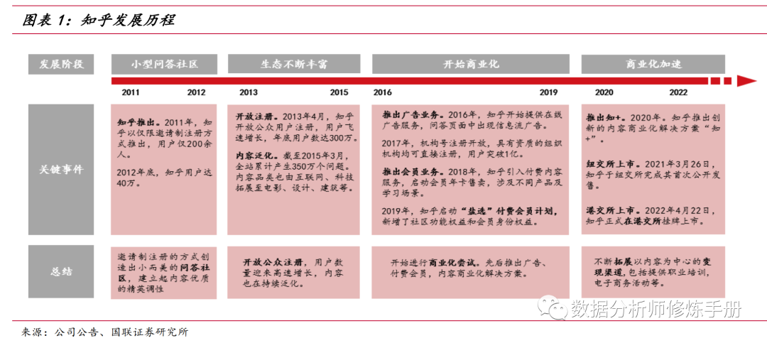 知乎的发展轨迹是一个典型的内容社区的发展轨迹,首先通过小规模高质量用户形成一个社区,在这一段时间,用户不断交流并不断生成高质量的内容。随后利用这些内容开始往外扩张,获取更多的用户加入这一社区,并期待他们中的一部分也能参与到内容创作中,然后开始尝试获取收益。