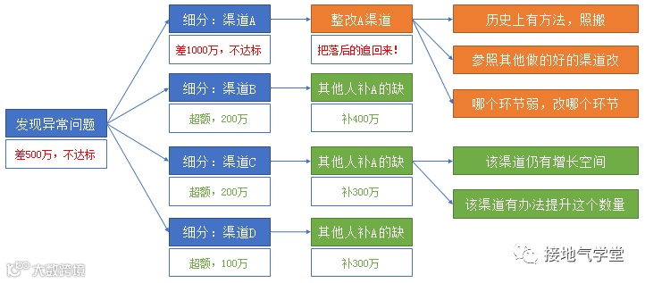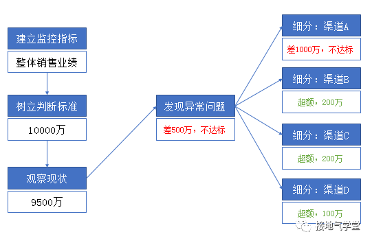 举个简单的例子:某公司有4条销售业务线,定了目标是月销1个亿,实际达成9500万,不达标。四条线表现如下图。则可以轻松看出,是A渠道出了问题(如下图)。