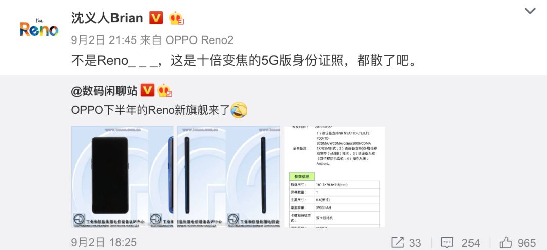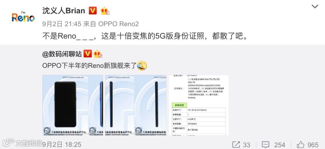 参数上,OPPO Reno 10X 5G旗舰电池容量最小值3930mAh,支持5G网络、5G+4G双卡双待,搭载骁龙855Plus+X50基带以实现5G网络支持,机身三围161.8*76.6*9.5mm(估计又是厚重型...前置应该还是Reno的扇形升降)。