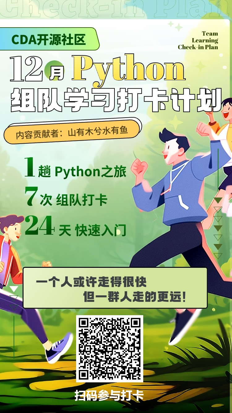 为了更好地学习Python,我们在12月组织了一个Python组队学习打卡计划,鼓励大家一起学习,一起进步。