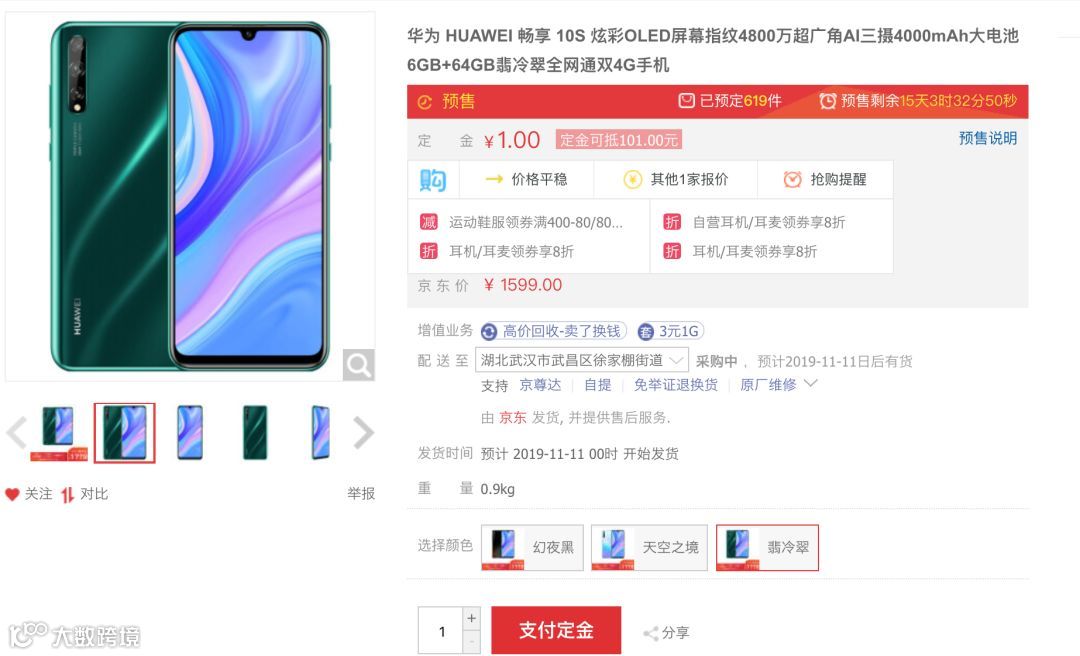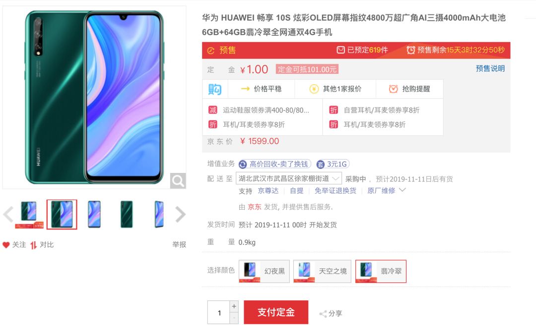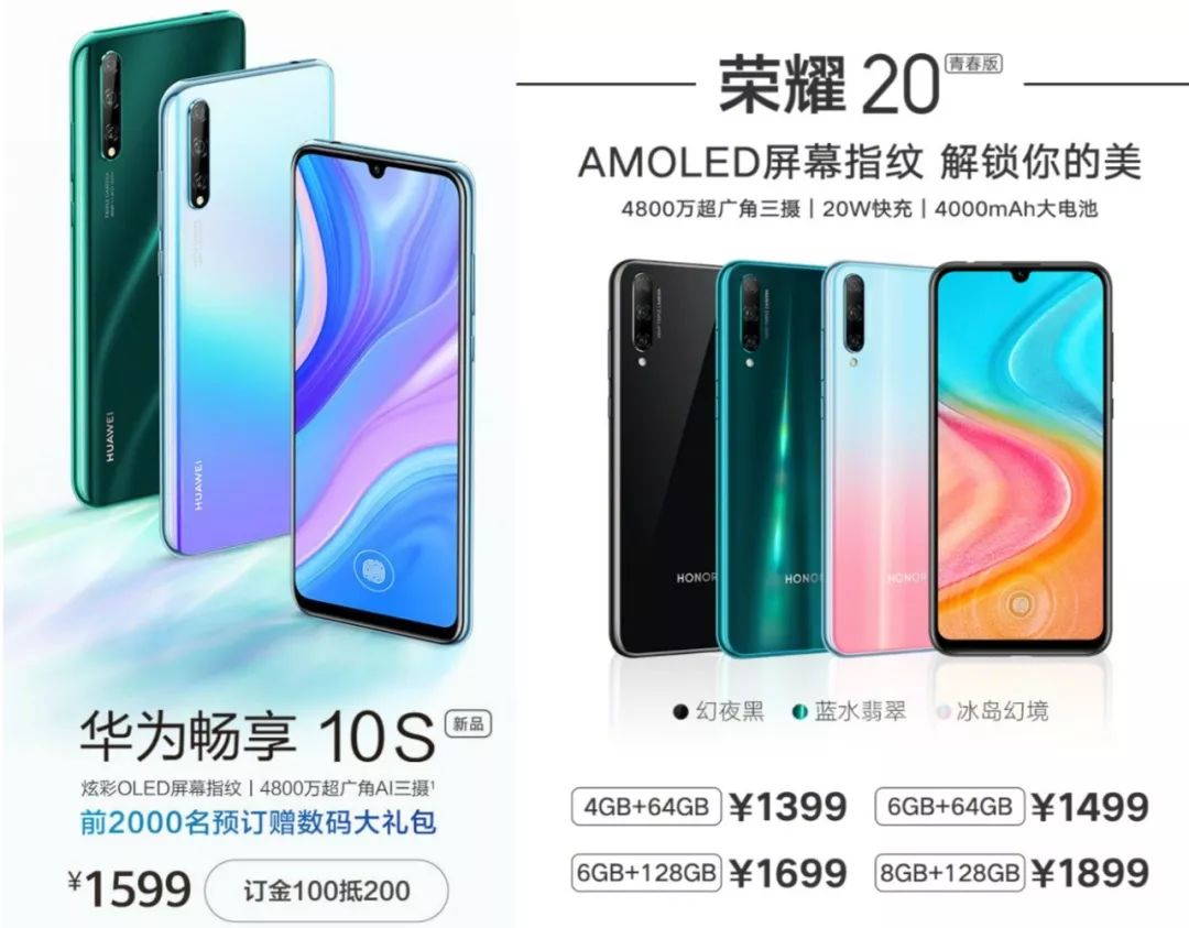 最后是售价,华为畅享10S 6+64GB售价1599元,支付订金100元可抵200元,到手价为1499元,和荣耀20青春版同规格一个价,将于11月11日0点正式开卖,总结一下区别:①后盖材质不同;②配色、logo不同;③充电器不同。等。