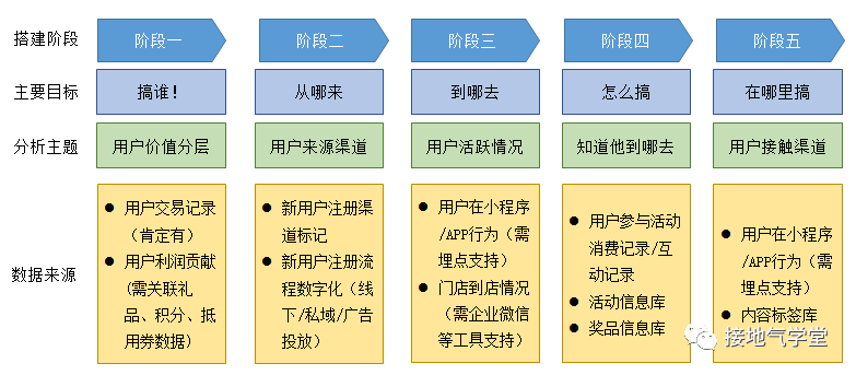 这一套用户分析体系搭建,是紧密结合数据采集过程的,充分考虑了:万一没有数据怎么办。由浅入深的推动(如下图)。