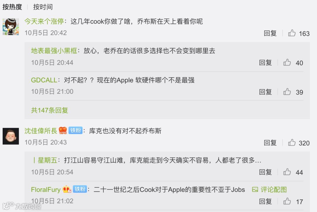 有网友直接评论「这几年库克你做了啥,乔布斯在天上看着你呢。」但也有用户表示打江山容易守江山难,库克对于苹果的贡献也不少,并没有对不起乔布斯。