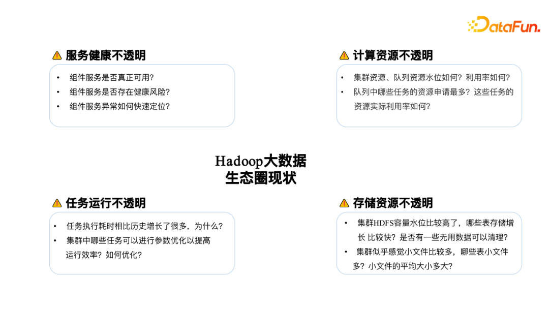 首先是服务健康不透明。比如 HDFS、Hive 等这类组件服务,他们的健康情况是不透明的。主要表现为三个方面,第一是组件服务是否真正可用是不透明的,很多公司会使用进程监控来看服务是不是异常了,但实际上很多情况下进程变成了僵尸进程,看起来进程还在,但是服务已经不可用了。第二是服务虽然可用,但实际上存在健康风险,可能运行一段时间后就不能正常工作了。第三是服务组件出现了异常,如何快速的定位、分析以及解决。这三个方面问题在原生的 Hadoop 生态里目前是没有提供解决方案的。