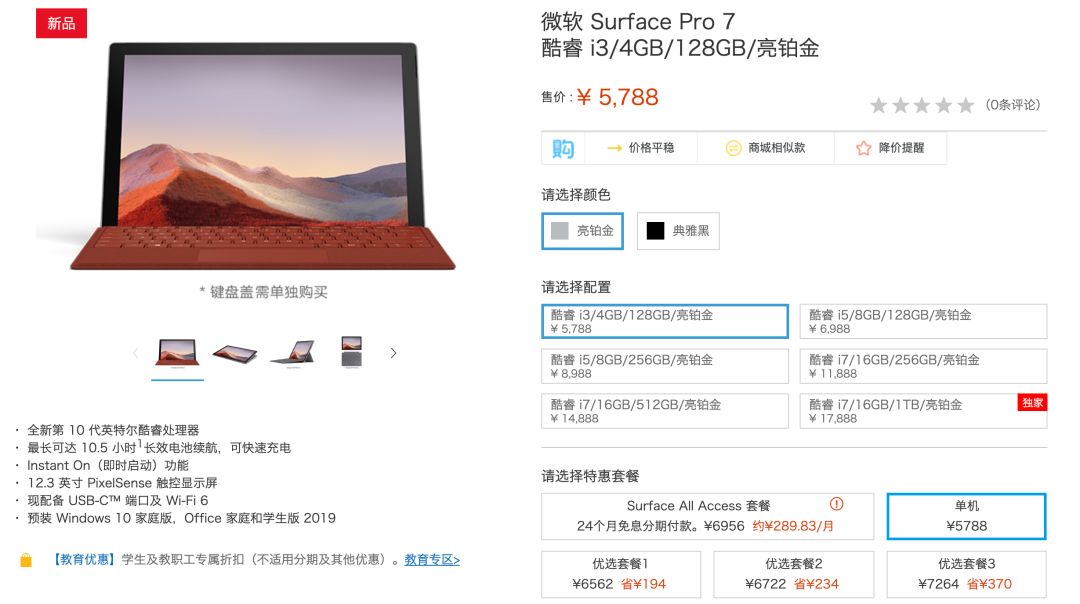 至于国行版,Surface Pro 7国行版目前已经在官方商城开启预售,由于新增酷睿i3版,起步价为5788元,最高配版Intel酷睿i7/16GB/1TB存储则售价17888元,将于11月4日起陆续发货。