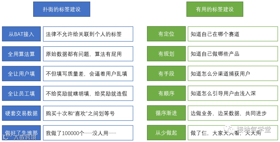 认真了解业务需求以后,就会发现:大面积打标签,根本没必要。把大面积的标签一股脑怼给业务用,更没必要!提供少而精的标签,培养业务使用习惯,循序渐进建成完整体系,才是项目成功的关键。