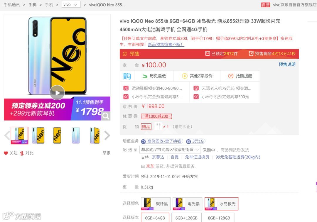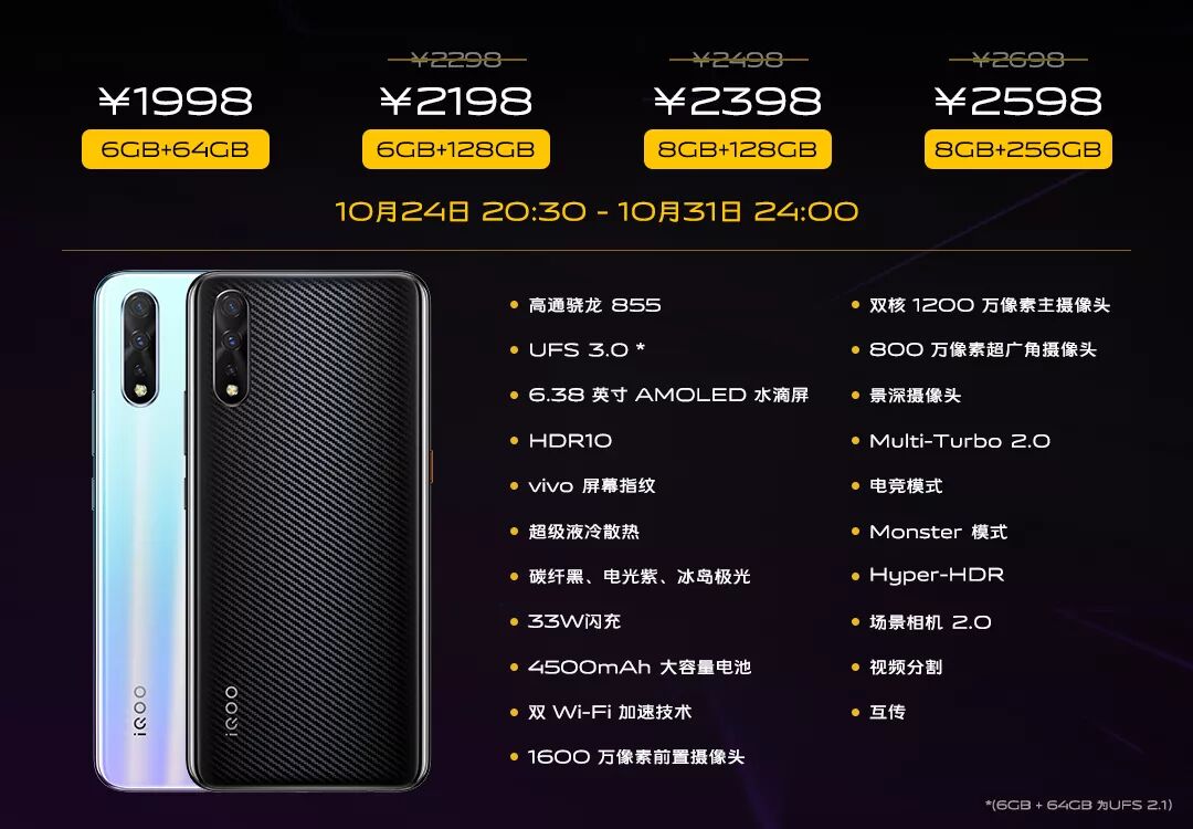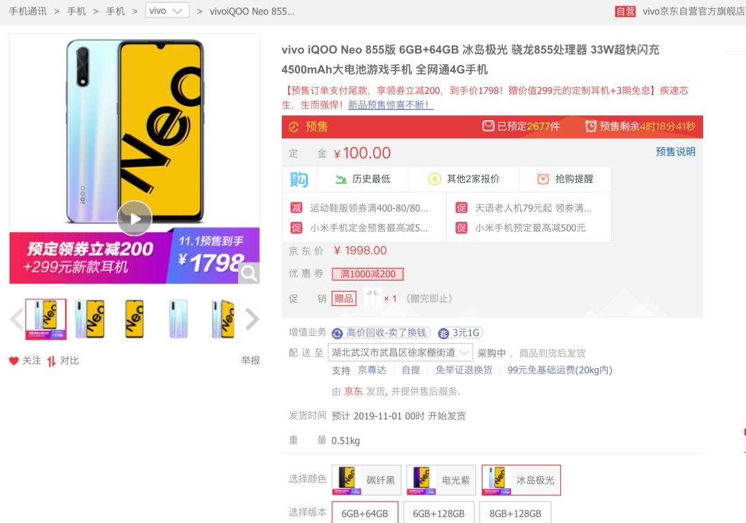 售价上,iQOO Neo 855版6+64GB售价1998元,6+128GB售价2298元,8+128GB售价2498元,8+256GB售价2698元。(在10月份以内购买除了64GB版本以外其他3个版本均直降100元。)将于11月1日0点正式开售。