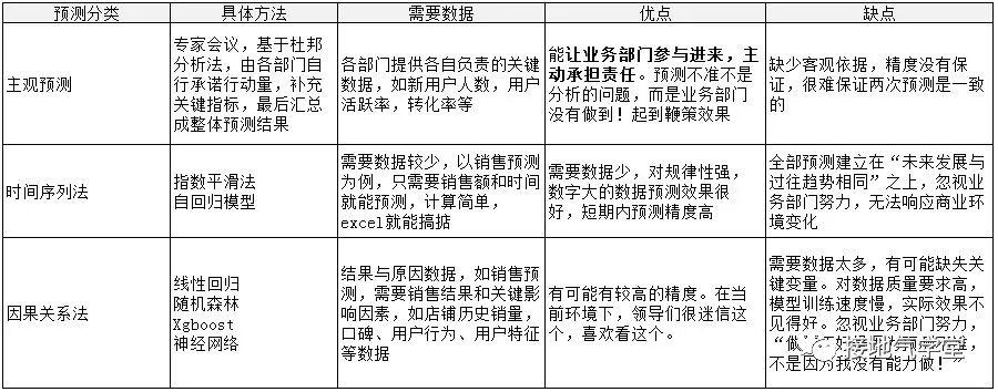包括基于时间序列和因果关系预测两类。商业分析很需要对未来发展趋势做预测,因此需要算法辅助。常见的用法、优缺点如下表所示: