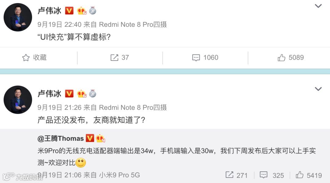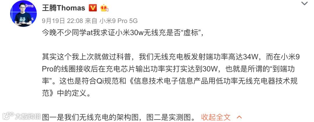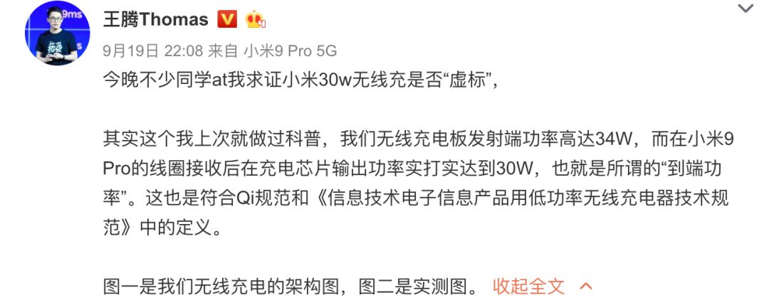 并连发多条微博强调,小米30W无线充不是虚标,将于小米9Pro首发的30W无线充电适配器端输出是34W,手机端输入是30W。