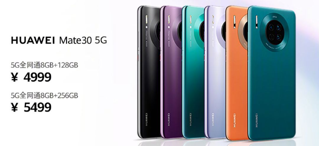 华为Mate 30 5G版:8+128GB售价4999元,8+256GB售价5499元,11月1日上午10:08开卖; 除了上述4个颜色外,5G版还额外提供青山黛、丹霞橙2款素皮设计。