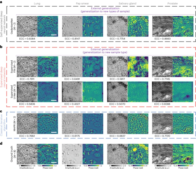 为验证 GedankenNet 的外部泛化能力,研究人员将 GedankenNet 模型与其他监督学习模型(基于相同的人工图像训练集训练而成)、迭代相位恢复算法进行了对比,测试数据采用包括人体组织切片和宫颈涂片在内的实验全息图。