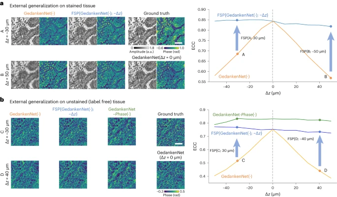 结果显示,在使用偏焦全息图进行测试时,GedankenNet 输出了正确的(物理一致的)偏焦复杂场,而不是产生幻觉和非物理随机光场。