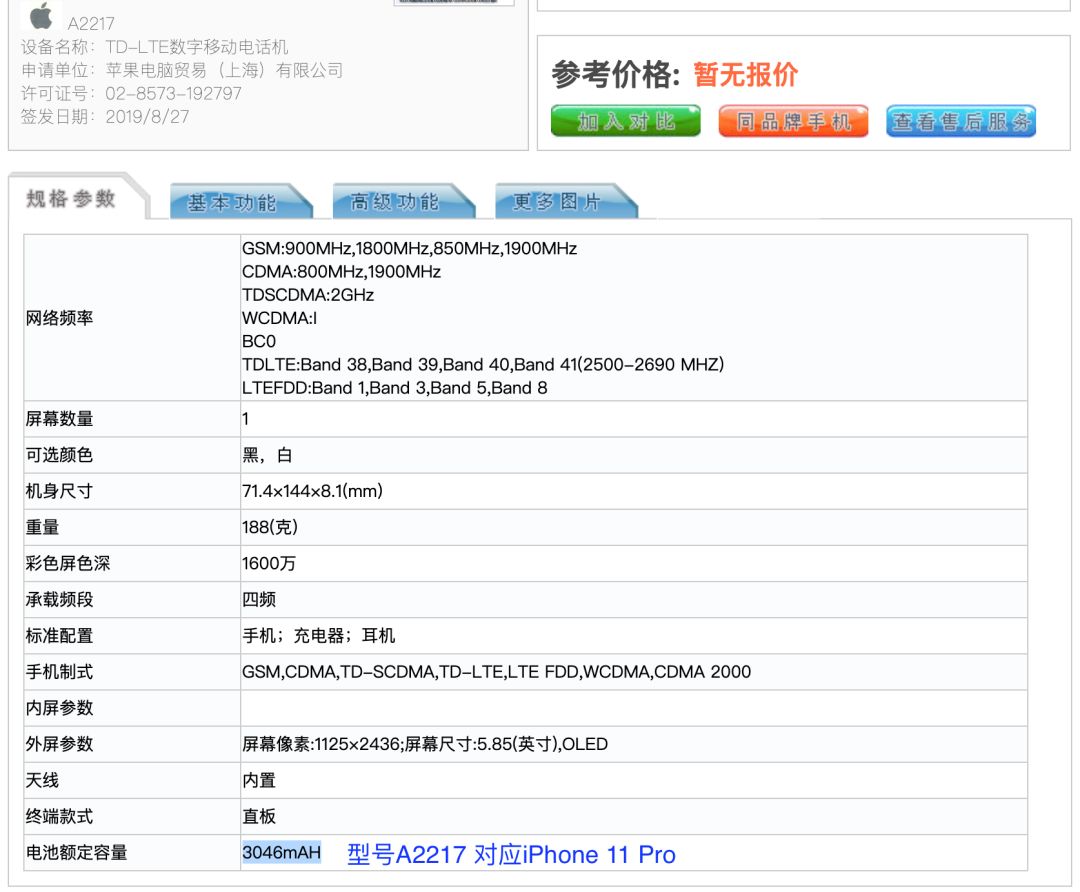 iPhone 11 Pro即XS接班者,也标配4GB RAM内存,并提供64GB、256GB、512GB三个储存版本,电池容量最小值3046mAh,典型值预计在3100mAh左右。