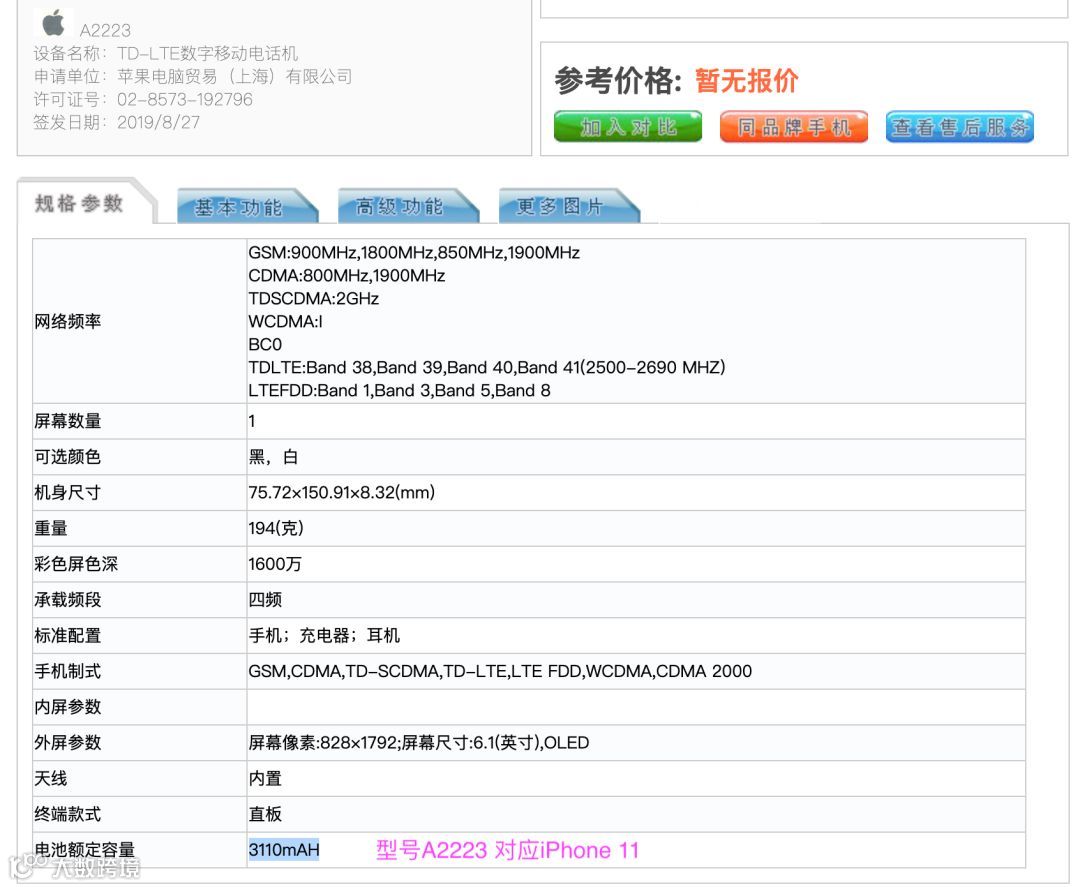 iPhone 11即XR 2,标配4GB RAM内存,提供64GB、128GB、256GB三个储存版本,电池容量最小值3110mAh。(注:工信部的电池容量均写最小值,而厂商宣传通常写典型值。)