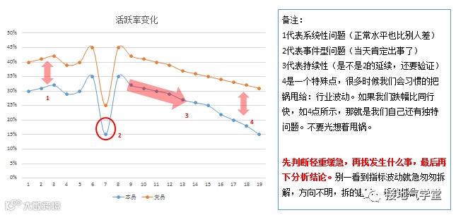 看过活跃率、活跃人数指标的同学都知道,这玩意日常波动太多了。几乎大事小事都会对活跃率产生影响。有时候分析活跃率下跌的报告还没交,丫自己就涨回来了。结果每天纠结于“为啥又高了/低了1%!”累死自己,还没找到病根。