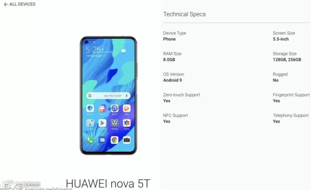 配置上,荣耀20 SE对应的应该是之前海外曝光的华为Nova 5T,将采用5.5英寸LCD挖孔屏,搭载性能超骁龙730G的麒麟810处理器,支持NFC,将提供8GB+128/256GB连两个储存版本。