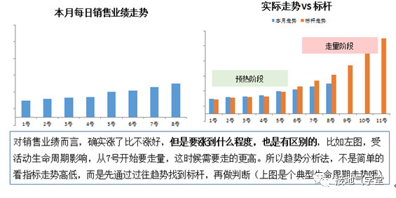 因为已经明确了“销售指标越高越好”,所以只要观察数据就好了,我们看到一天比一天好,所以能下结论:销售趋势向好。下边可以分析为啥销售这么好了。你看简单吧,90%的网上文章、数据分析课都是这么教的。