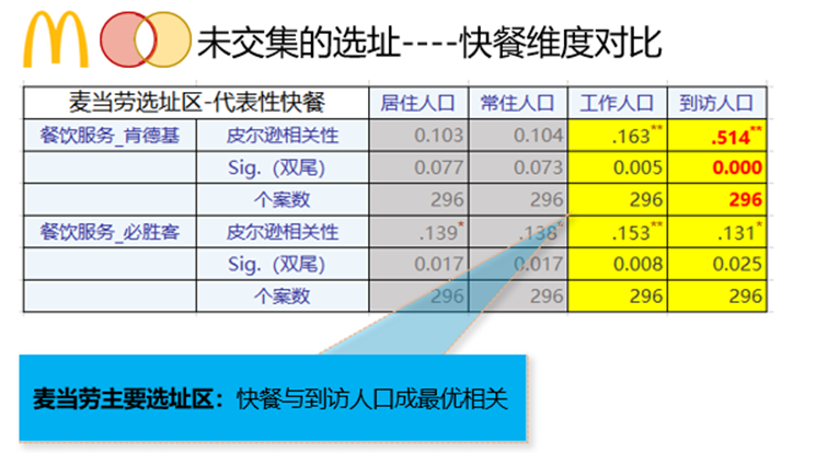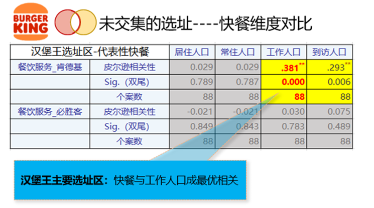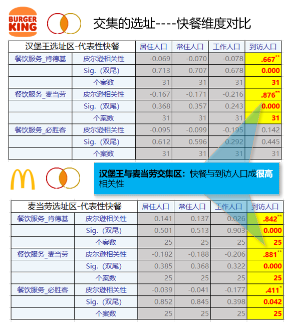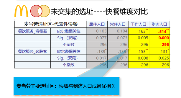 。在麦当劳单独选址区的快餐仅和到访人口呈现0.5左右的相关度,远不及汉堡王与麦当劳同时出现区域的0.8以上的相关度。