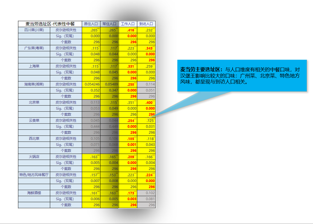 原因,如上图所示,在麦当劳的单独出现区域,与汉堡王的主要相关的口味中餐,如广东菜;以及汉堡王的重要的引流中餐:本地菜-北京菜、地方特色风味,都与工作人口没有了有效相关性,仅与到访人口呈现不高的相关。