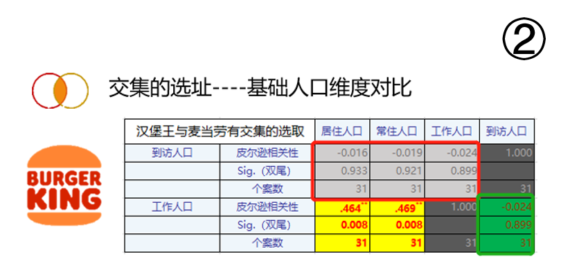 见上图,汉堡王单独选址区的快餐,与工作人口成有效相关,而麦当劳单独选址区,是与到访人口成有效相关