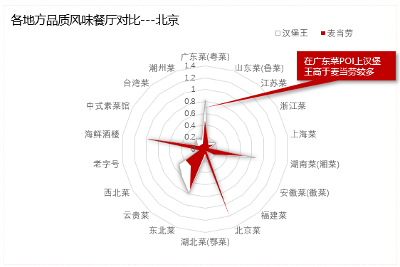 对汉堡王和麦当劳的北京门店进行了对比,我们发现在地方风味菜系上,汉堡王选址区的广东菜