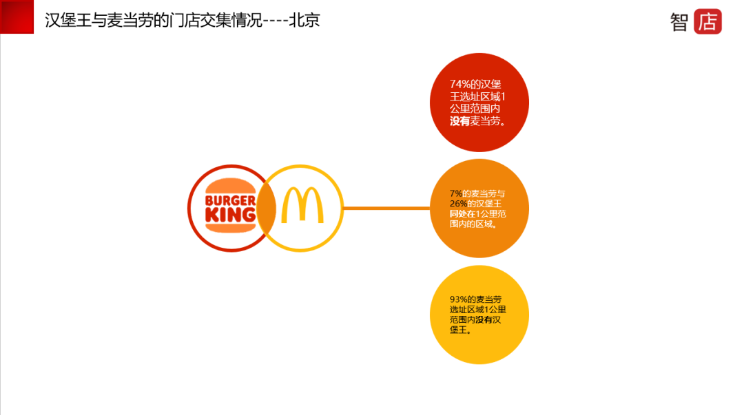)会告诉你,其实仅有26%的汉堡王在选址区周围1公里范围内会出现麦当劳,大部分的汉堡王是没有与麦当劳同时出现在一个区域的。