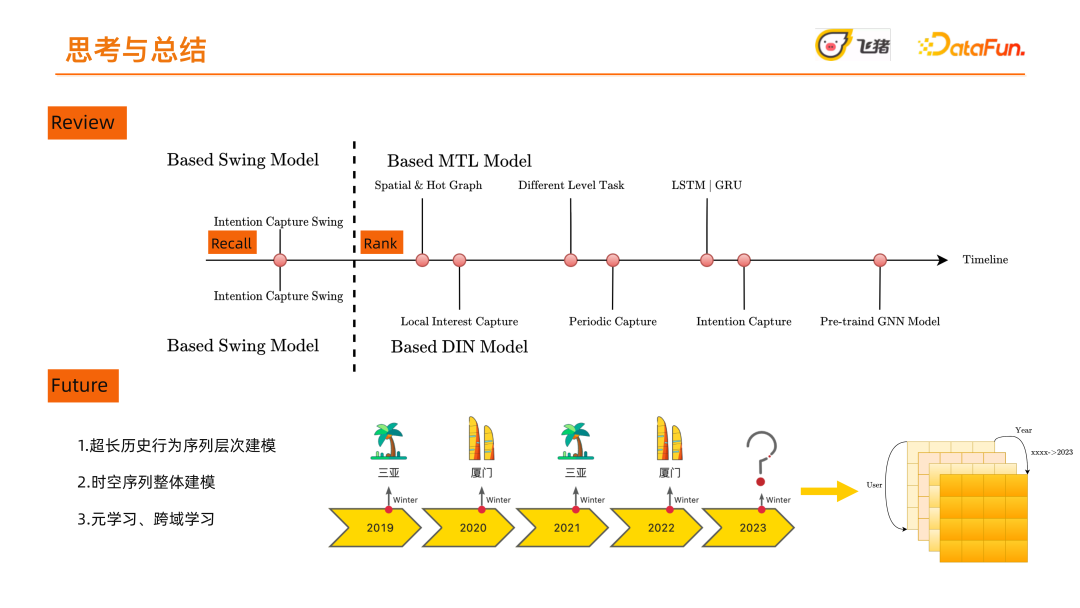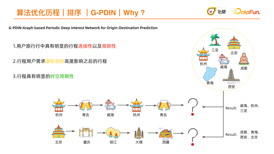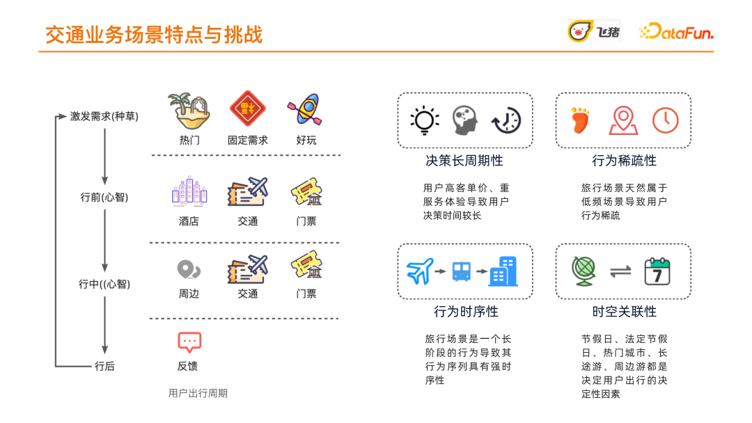 行前决策,假设暑假来了,用户想着怎么出去玩,首先是没有任何特定城市的明确需求。比如要考虑去南方城市,或者是华东城市。会选择华东哪一个城市呢?是杭州、苏州还是上海,还是最后去上海。以上的行前决策行为是非常重要的,决策过程在算法中相当于一个区域缩减行为,把目的地候选集一步一步地变小,最终得到一个比较准确的推荐,如何去建模行前决策是一个难点。 -